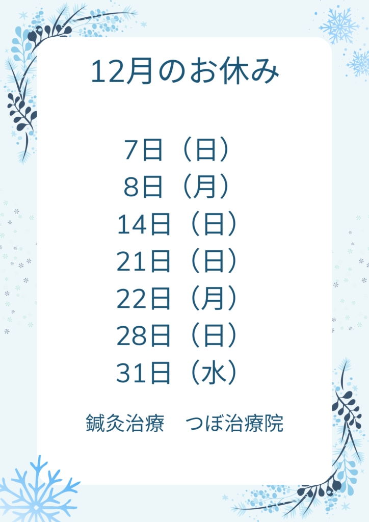 12月は毎週日曜と8日(月)・22日(月)・31日(水)をお休みとさせて頂きます。