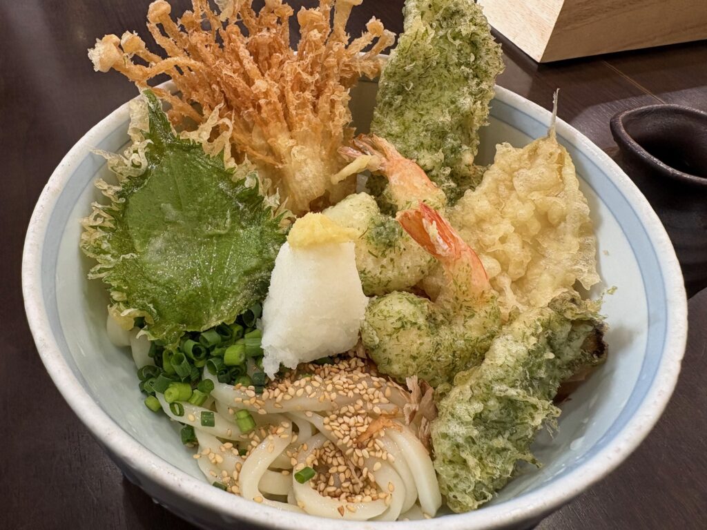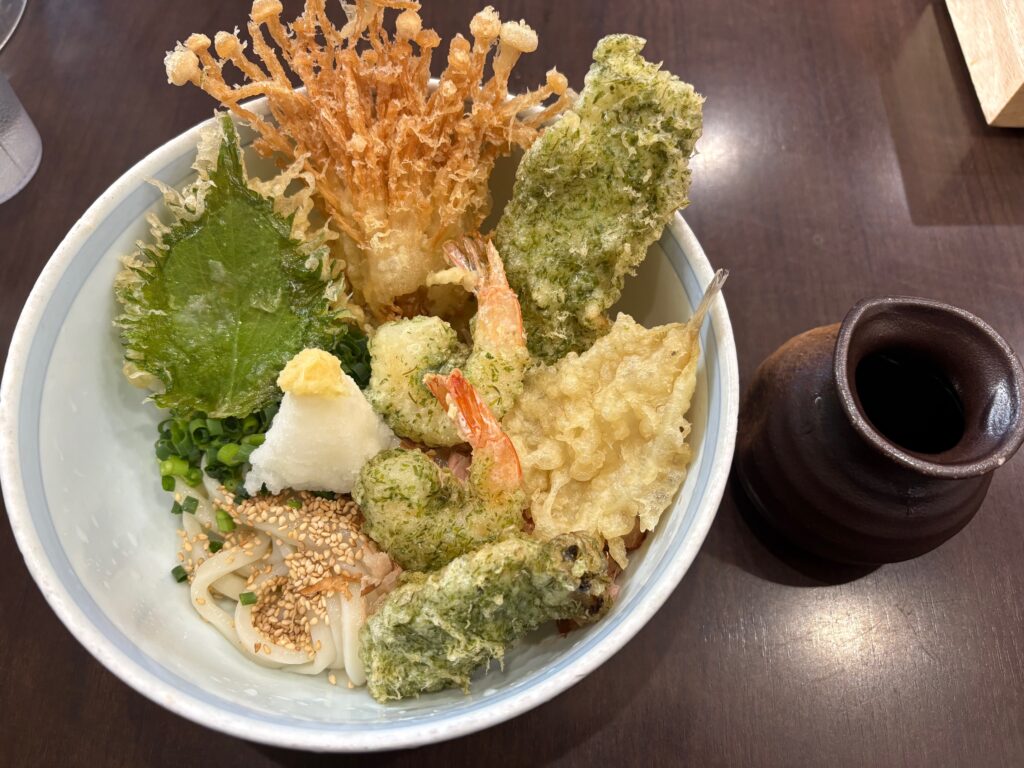 揚げたてのてんぷらと冷たいさぬきのぶっかけ。